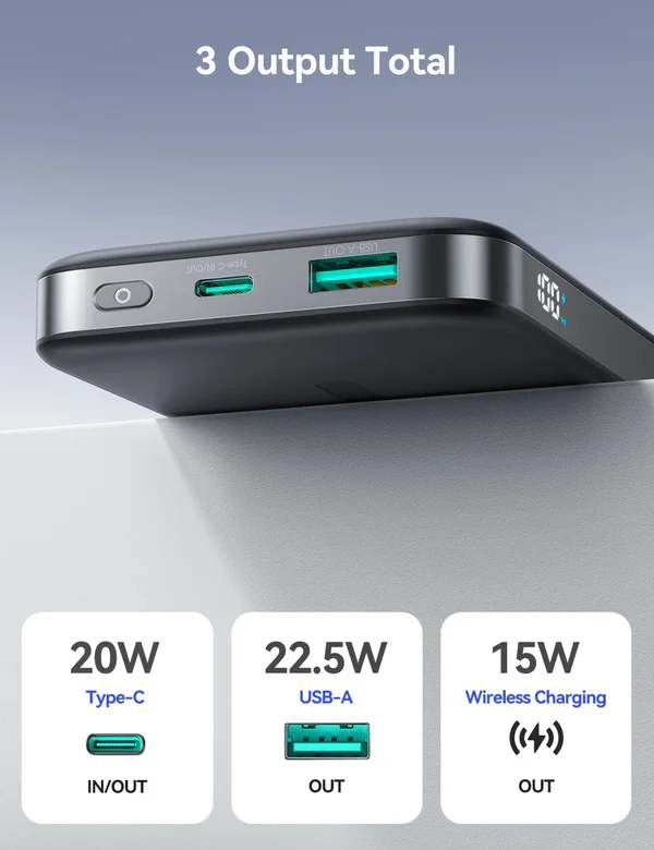 شحن سلكي خارق بقوة تصل إلى 22.5 واط: هل أنت في عجلة من أمرك؟ استخدم منفذ USB-A بقوة 22.5 واط أو منفذ Type-C (PD) بقوة 20 واط لشحن أجهزتك بسرعة فائقة تصل إلى 3 أضعاف الشواحن التقليدية.