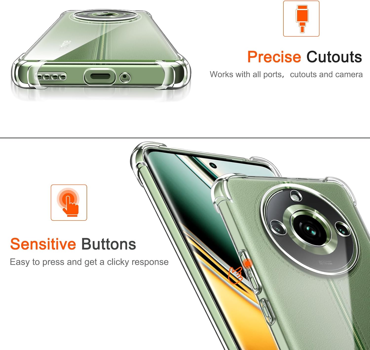 زوايا معززة لامتصاص الصدمات والتلف ومقاومة الأوساخ. شفافية واضحة للغاية تبرز تصميم الهاتف الأصلي. تصميم نحيف وسهل الحمل في الجيب. سهولة الوصول إلى جميع عناصر التحكم والأزرار. متوافق مع الشحن اللاسلكي.