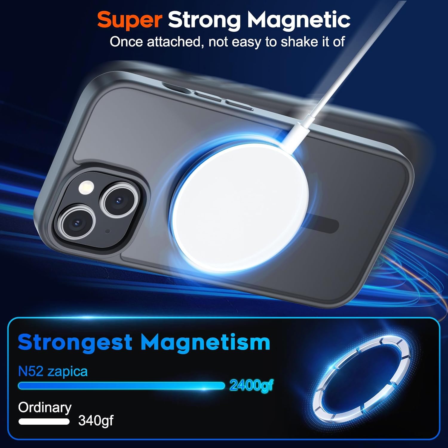 - امتصاص مغناطيسي فائق: يحتوي جراب موبايل آيفون 15 هذا على مغناطيس قوي مدمج مع امتصاص فائق القوة، متوافق مع شواحن ماج سيف وغيرها من شواحن كيو اي اللاسلكية، يشحن دون إزالة جراب الموبايل، سريع وثابت.