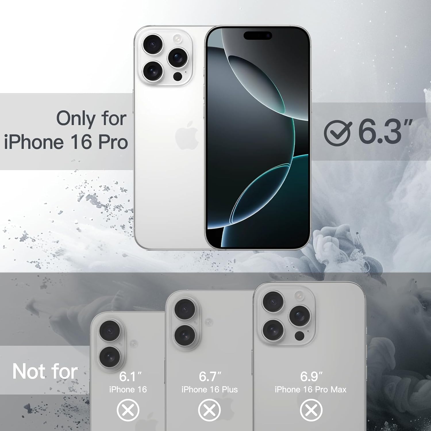 - [التوافق] يناسب تمامًا موبايل ايفون 16 برو 6.3 بوصة. ملاحظة: لا يناسب ايفون 16 / 16 بلس / 16 برو ماكس. تصميم خفيف الوزن ورفيع
