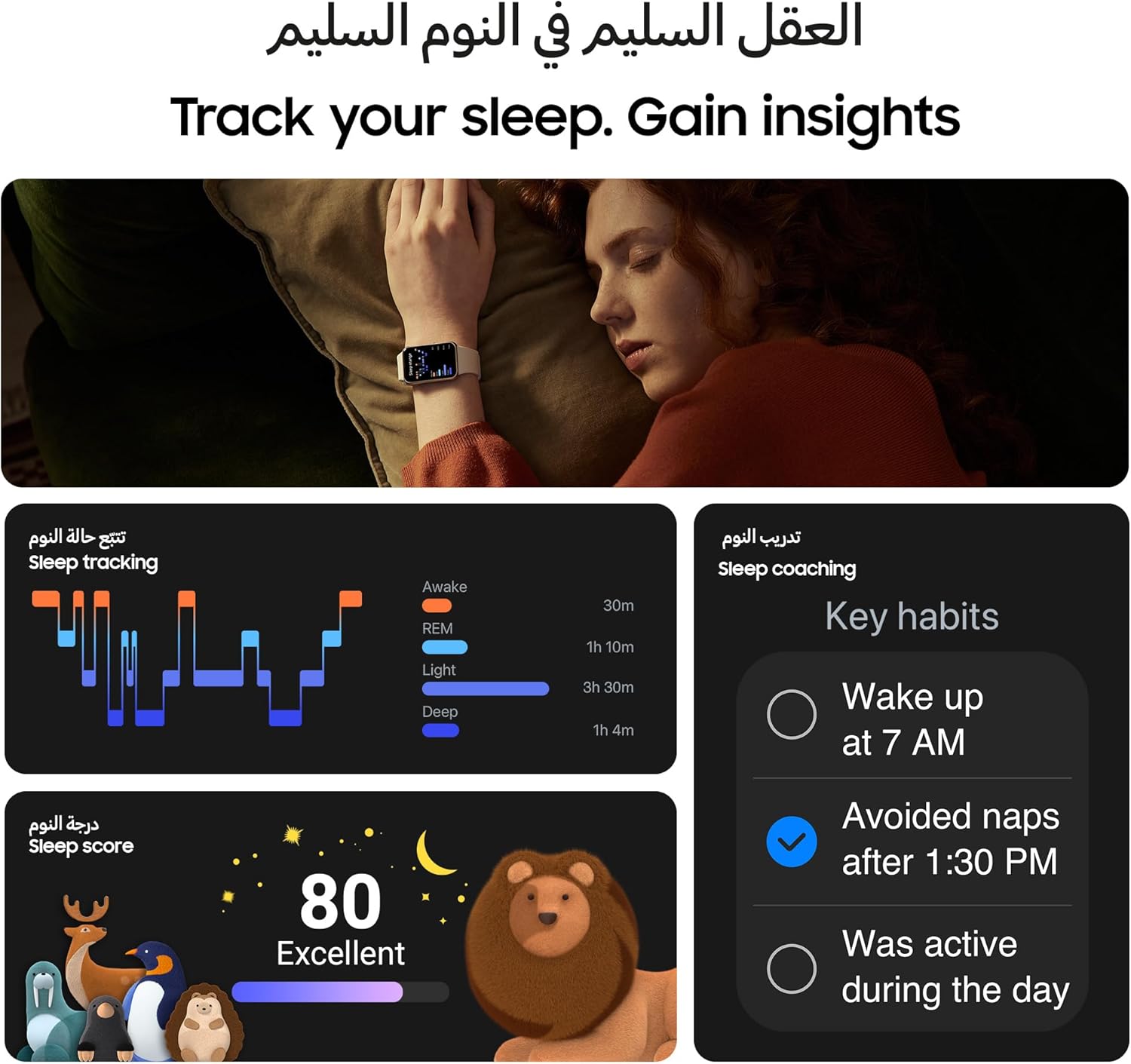 يستقر جهاز Galaxy Fit3 النحيف والخفيف براحة تامة على معصمك، حيث يراقب أنماط نومك بصمت طوال الليل. اكتشف تفاصيل مراحل نومك والشخير ومستوى الأكسجين في الدم. احصل على نقاط “النوم” واستفد من “توجيهات النوم” واستمتع بالنوم الهانئ الذي تستحقه.