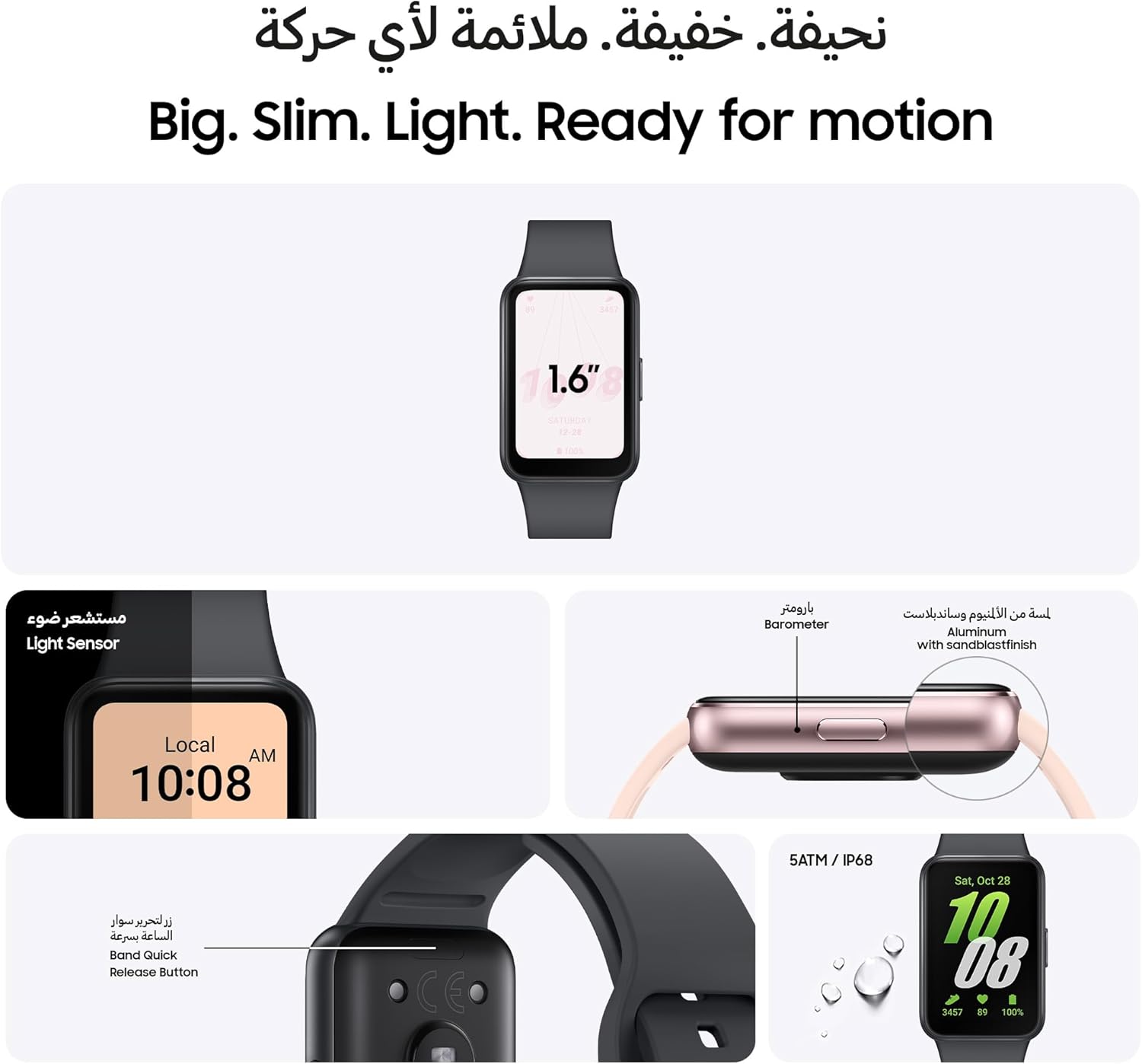 - بفضل تصميمه الأنيق وخفيف الوزن، يتناسب Galaxy Fit3 بشكل مريح مع روتينك الرياضي. هيكله النحيف المصنوع من الألومنيوم، الذي يزن 18.5 غرام فقط، لن يثقلك أو يعيقك أثناء التمرين. كما أنه مقاوم للماء والغبار بفضل تصنيفي 5ATM وIP68. كن مستعدًا للتمرين وحافظ على لياقتك