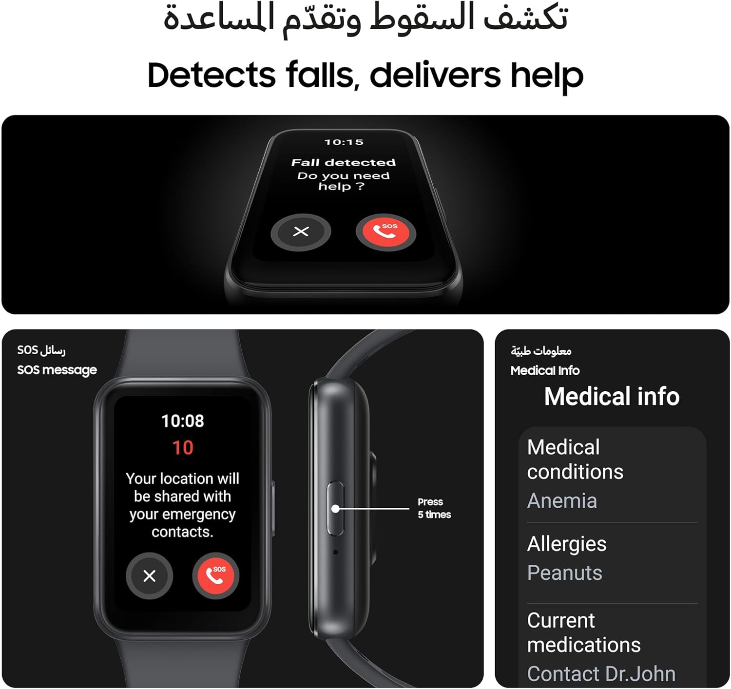 - توفر الشاشة الكبيرة مقاس 1.6 بوصة مساحة كبيرة للتفاعل مع جهاز Galaxy Fit3. شاهد واضغط ومرّر بسهولة لإنجاز المزيد في وقت أقل.