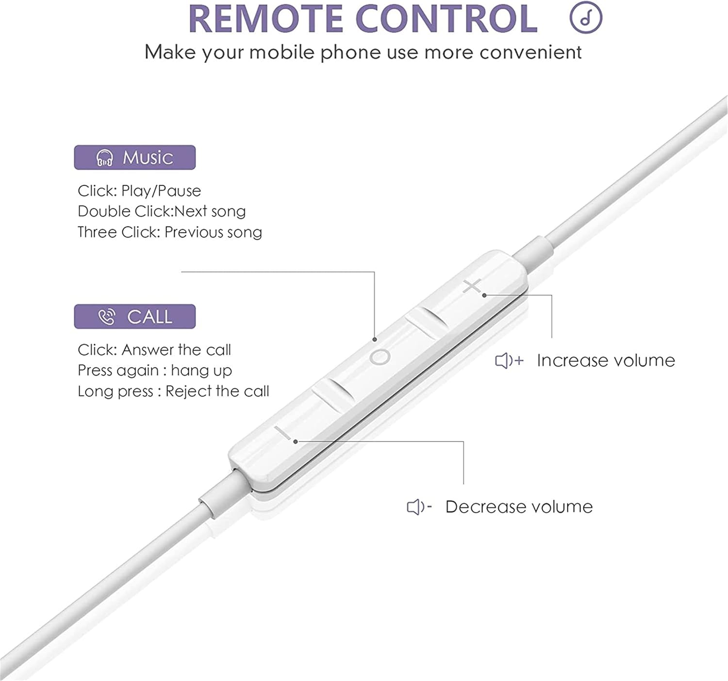 • ♫ [الميكروفون والتحكم في مستوى الصوت]: يأتي كابل سماعة الرأس مع ميكروفون مدمج ووحدة تحكم. زر واحد متعدد الوظائف يسمح لك بالرد على المكالمات أو إنهائها وتشغيل/إيقاف مؤقت والقفز وتشغيل الأغاني باستخدام سماعات الرأس. لا حاجة لإخراج هاتفك. ميكروفون مدمج يسمح لك بالاتصال بدون استخدام اليدين.
