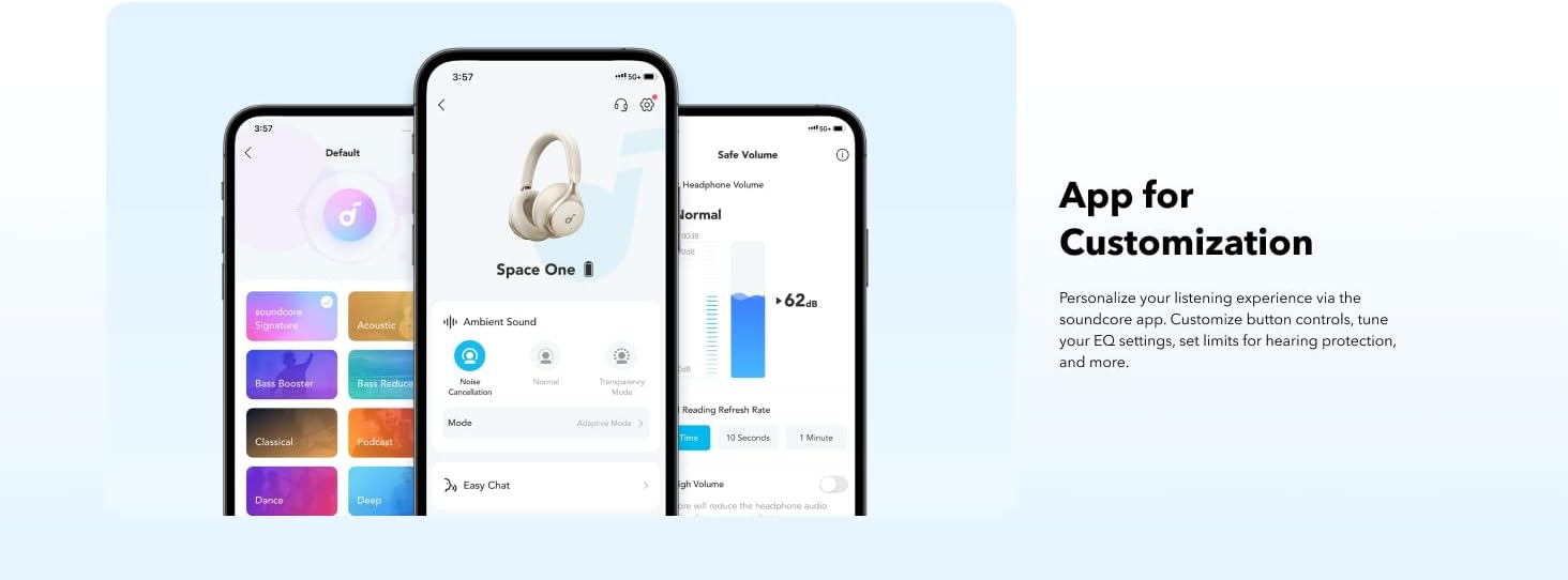 - تقليل صوت أقوى مرتين: حافظ على تركيزك أثناء الرحلات الصاخبة باستخدام هيكل إلغاء الضوضاء المطور الخاص بنا. تتفوق سبيس ون في حجب الأصوات متوسطة إلى عالية التردد مع تقليل الصوت مرتين أكثر.