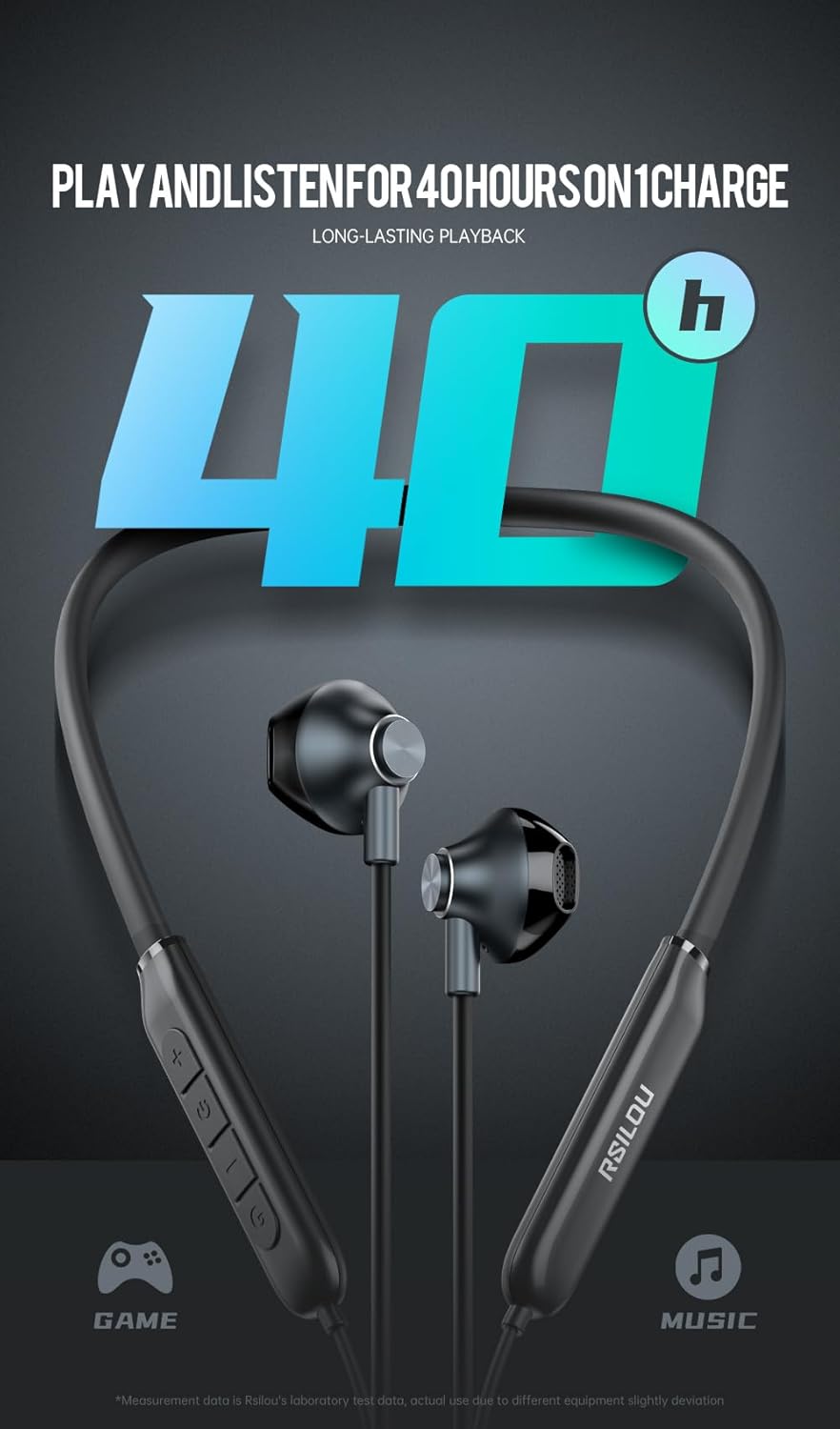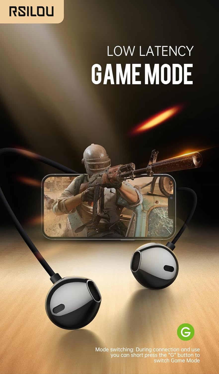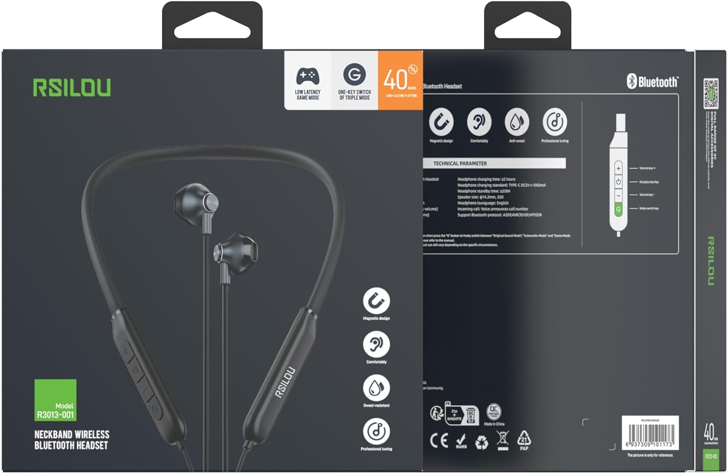 سماعة رأس طوق رقبة لاسلكية من Rsilou 3013-001 بلوتوث 5.3 من رسيلو، وقت تشغيل 40 ساعة، مقاومة للعرق IPX4، وضع مزدوج للالعاب بدون تأخير، وظيفة مفتاح، ضبط احترافي، سماعات اذن مغناطيسية .