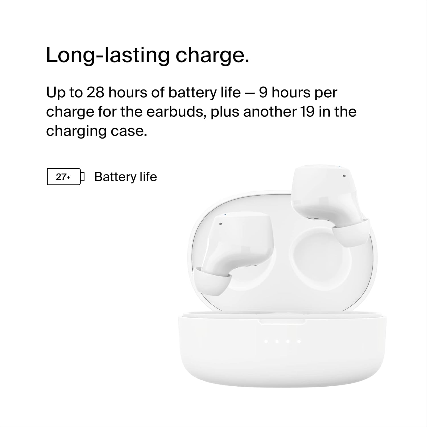 - عمر بطارية يصل إلى 28 ساعة – 9 ساعات من التشغيل لكل شحنة لسماعات البلوتوث، بالإضافة إلى 19 ساعة إضافية من البطارية في علبة الشحن، مما يعني أنه يمكنك التحدث والاستماع والبث دون انقطاع.