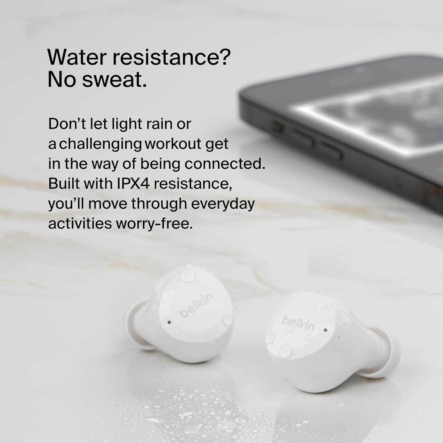 - سماعات مقاومة للعرق والماء بتصنيف IPX4 مما يجعلها مناسبة للأنشطة الرياضية والجري، سواء كنت في الخارج أو في الجيم.