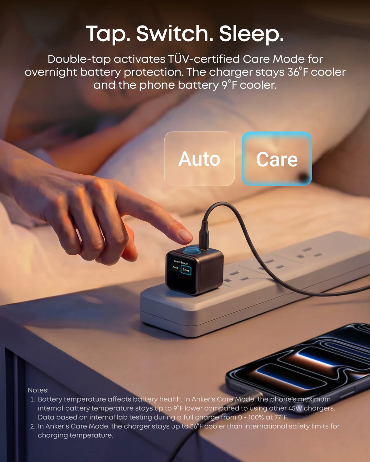 حماية متقدمة للبطارية: يتميز بوضع الرعاية Care Mode المعتمد من TÜV الذي يحافظ على برودة الشاحن بمقدار 36 درجة فهرنهايت وبرودة بطارية الهاتف بمقدار 9 درجات فهرنهايت لإطالة عمرها.