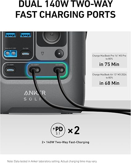 - طاقة هائلة أثناء التنقل: احمل الطاقة المحمولة إلى أي مكان ووفر 300 وات لأجهزتك. شحن سريع بمنفذين USB-C ثنائي الاتجاه بقوة 140 وات.