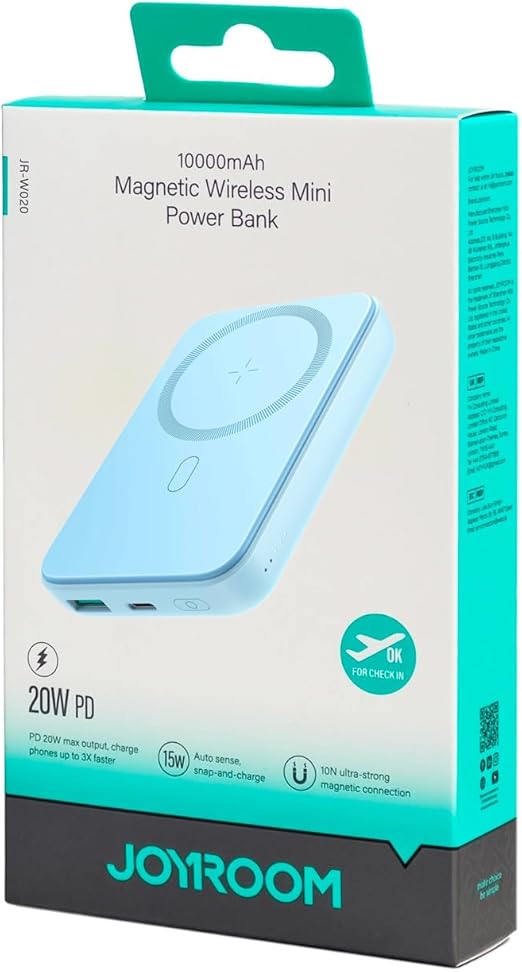 | قدّم المكونات المضمنة | 1 × باور بانك لاسلكي مغناطيسي بقدرة 20 واط وسعة 10000 مللي أمبير في الساعة من جوي رووم W020، أزرق |