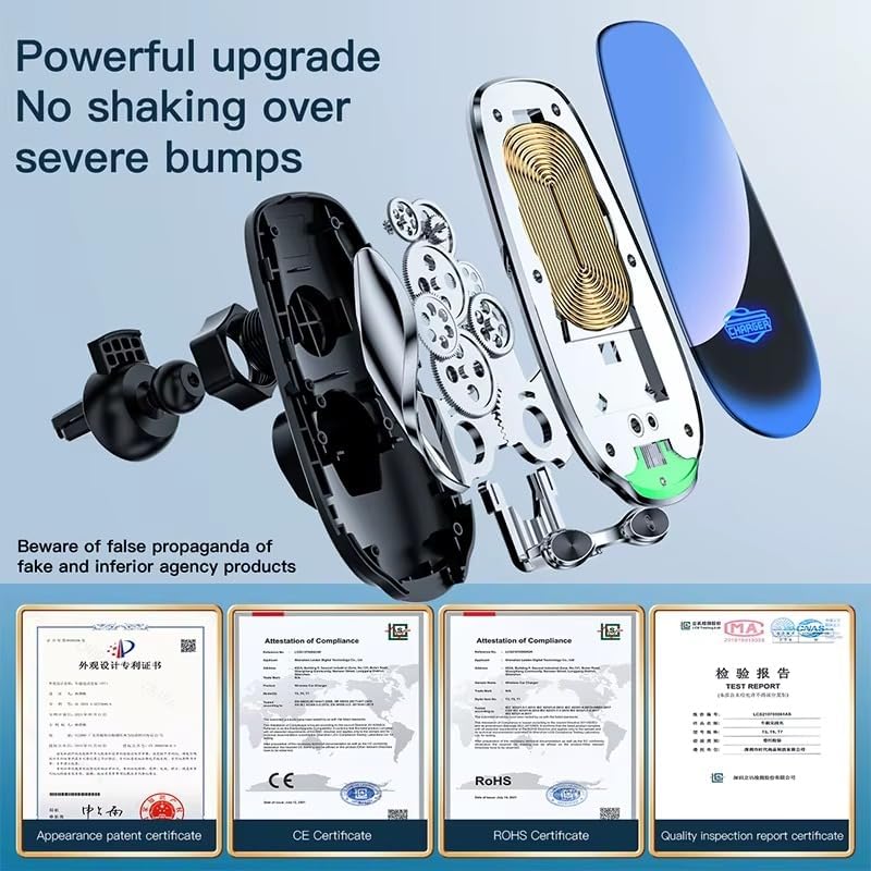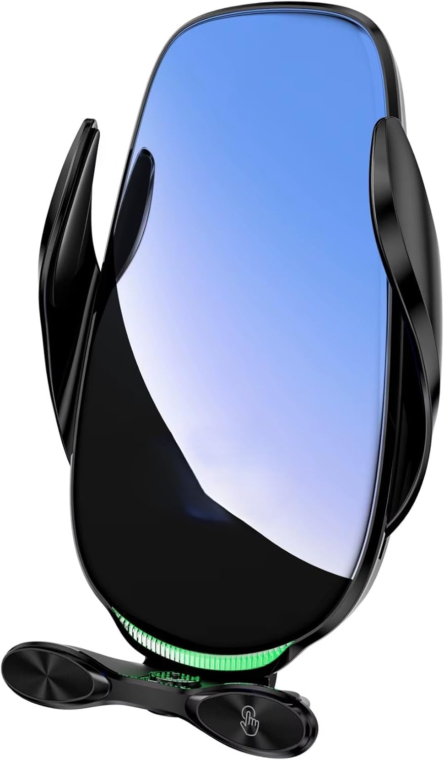 • 【مشبك تلقائي ذكي مطور】سيتم فتح أذرع وقدم شاحن السيارة اللاسلكي تلقائيًا بعد توصيله بالطاقة، وسوف يتم تثبيته تلقائيًا بإحكام بمجرد وضع موبايلك فيه، لا تحتاج إلى ضبط القدم يدويًا لتثبيت الموبايل.