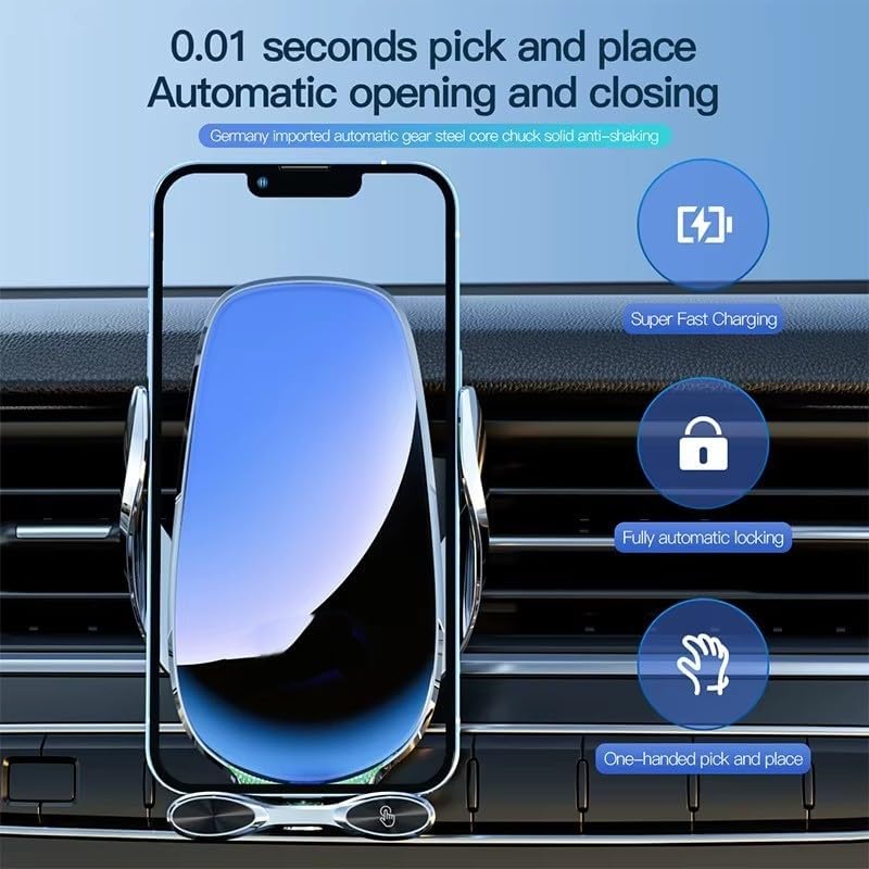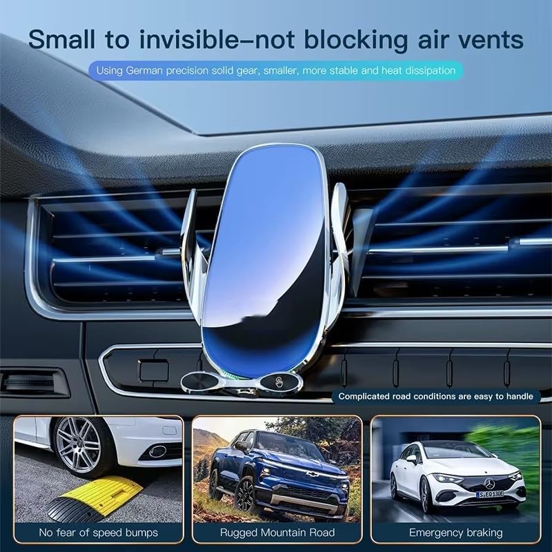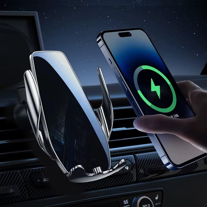 شاحن سيارة لاسلكي سريع 15 وات، حامل موبايل ذكي يثبت على فتحة التهوية مع دوران 360° بتوافق شامل وآمن لـ آيفون 15/14/13/12/11 وسامسونج جالاكسي S23/S22/S21.