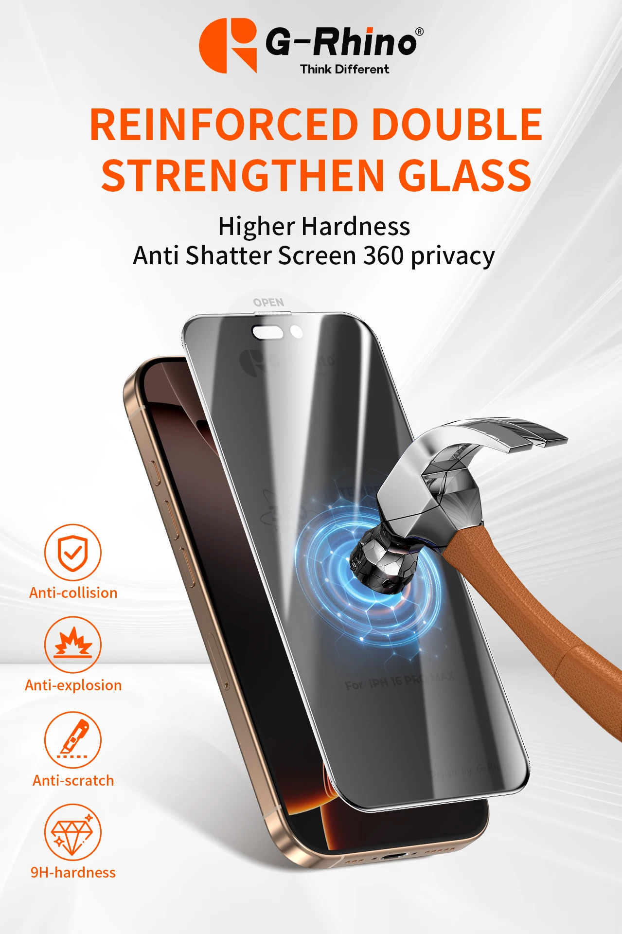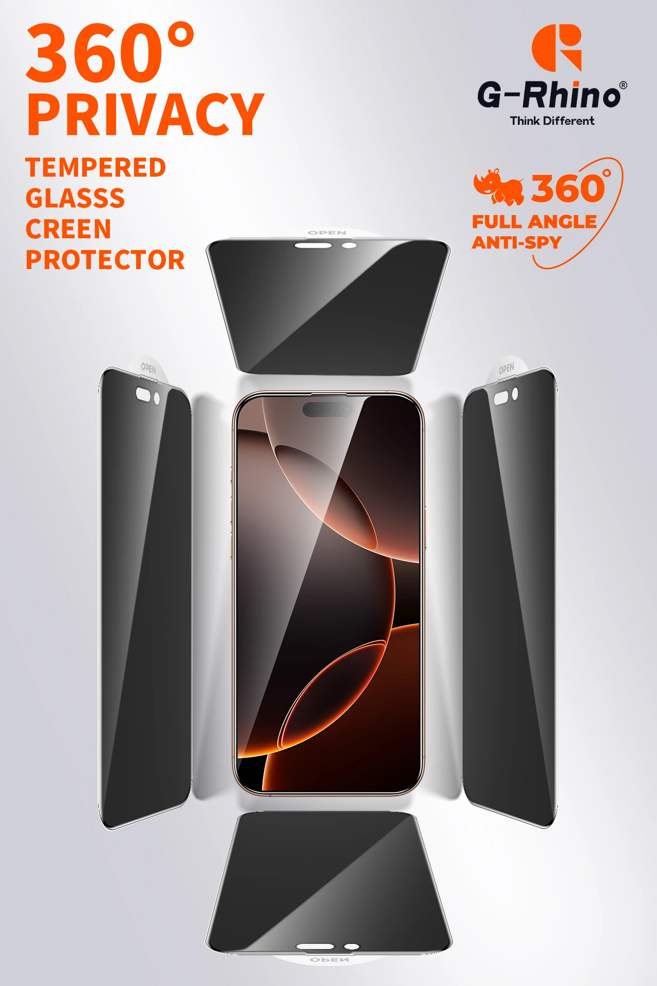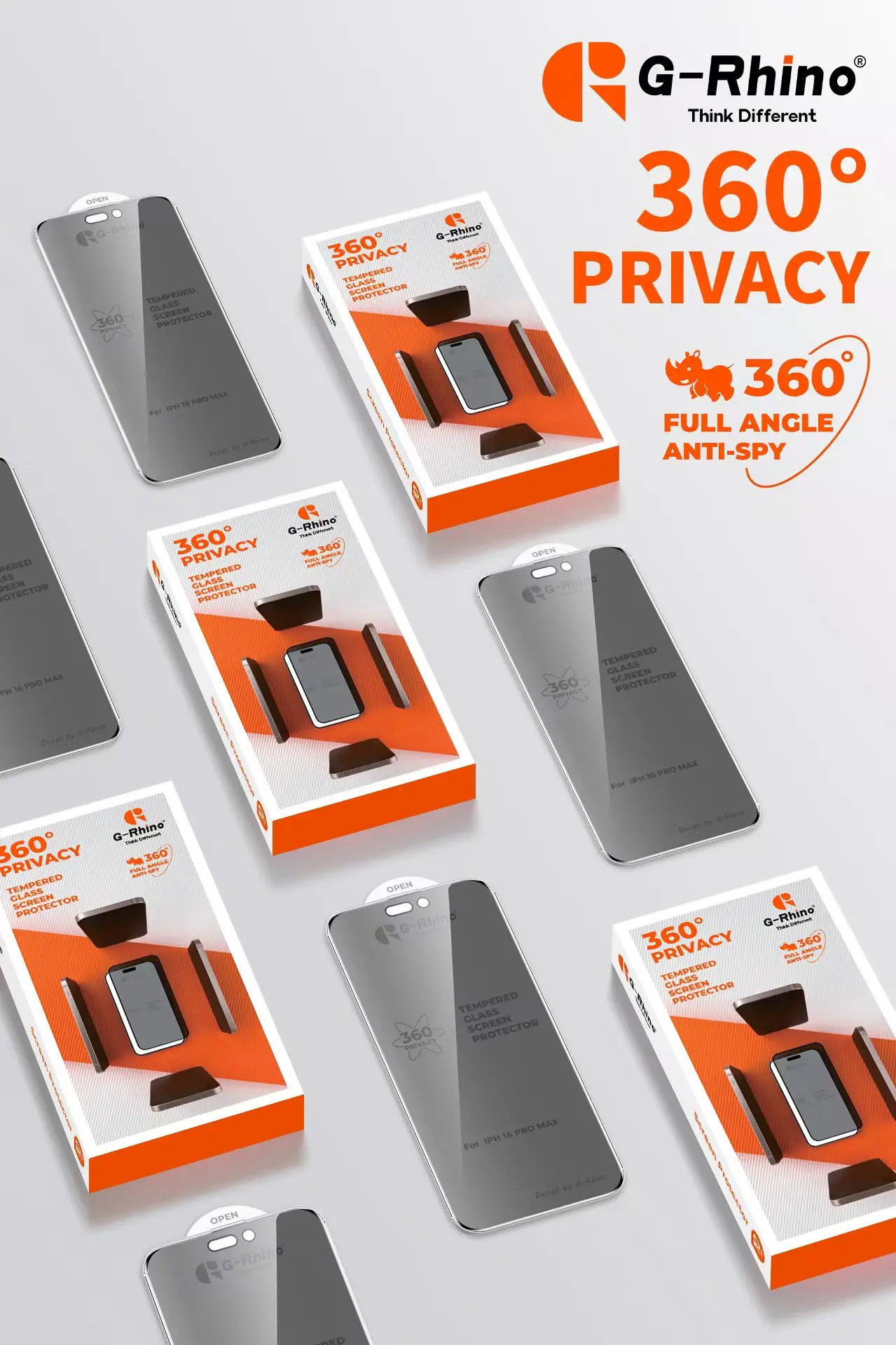 واقي الشاشة G-Rhino Private يتميز بكونه زجاج مقوى (Tempered Glass) بدرجة صلابة 9H لمقاومة الخدوش والصدمات، مع خاصية الخصوصية لحجب الرؤية الجانبية، ويحتوي على طبقات مقاومة للبصمات (Oleophobic)، ويوفر وضوحاً عالياً (HD Ultra Clearness) وحساسية لمس ممتازة، مع حواف منحنية (2.5D/3D) وتغطية كاملة للشاشة، ويأتي مع تقنية Full Glue لتثبيت مثالي، ويدعم التعرف على الوجه (Face ID) وخصائص مضادة للوهج (Anti-Glare) لحماية العين.