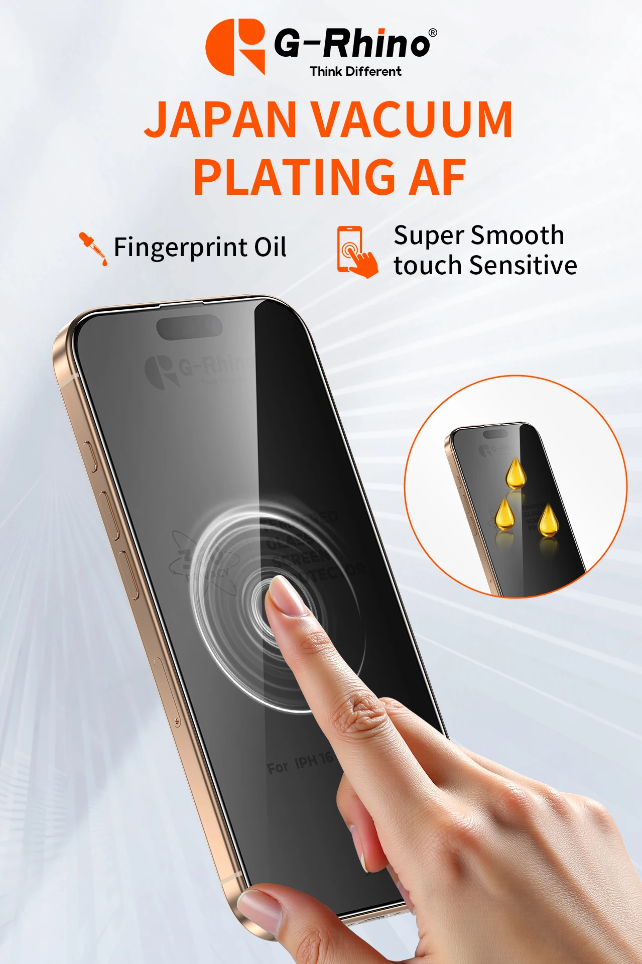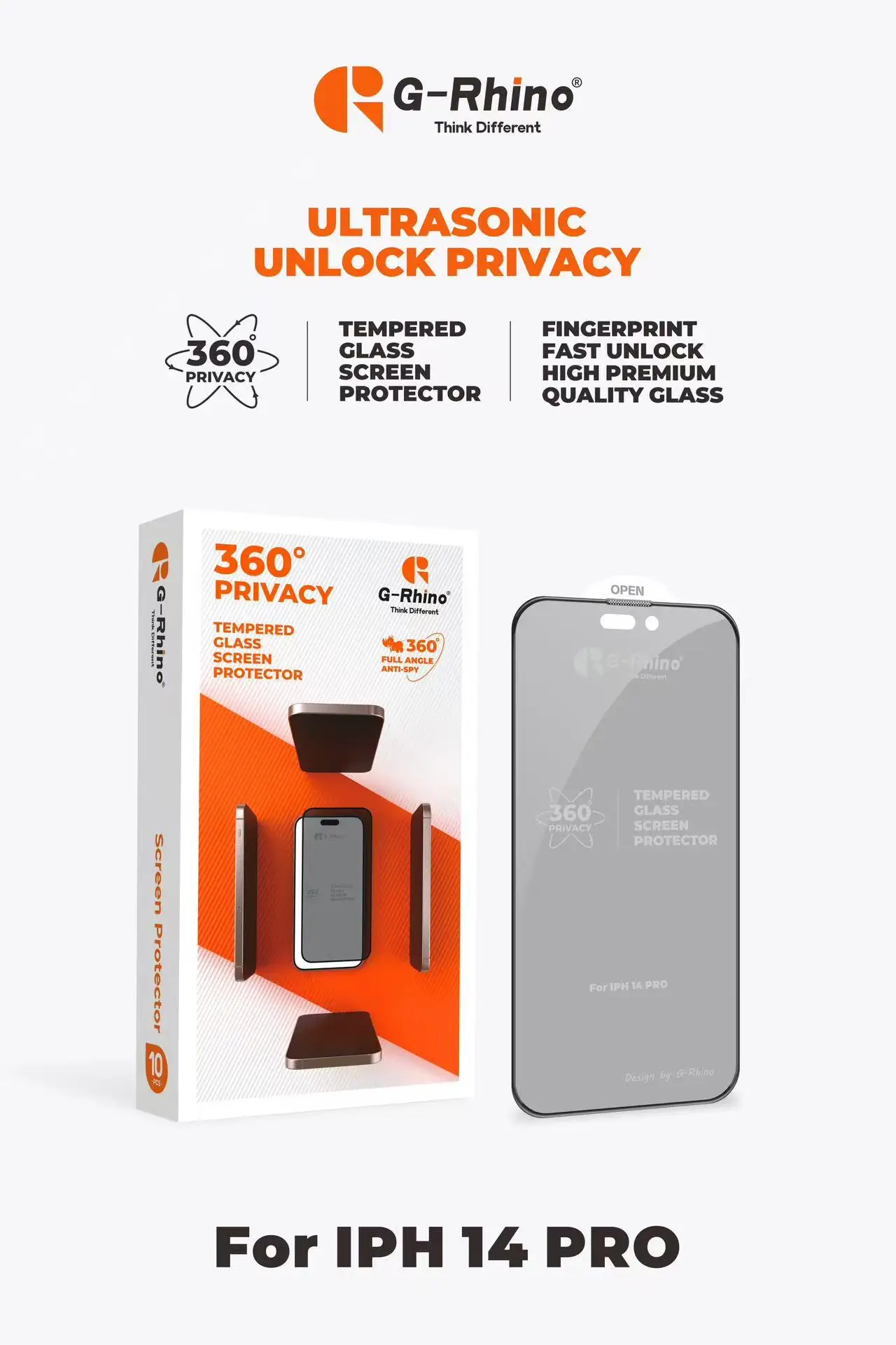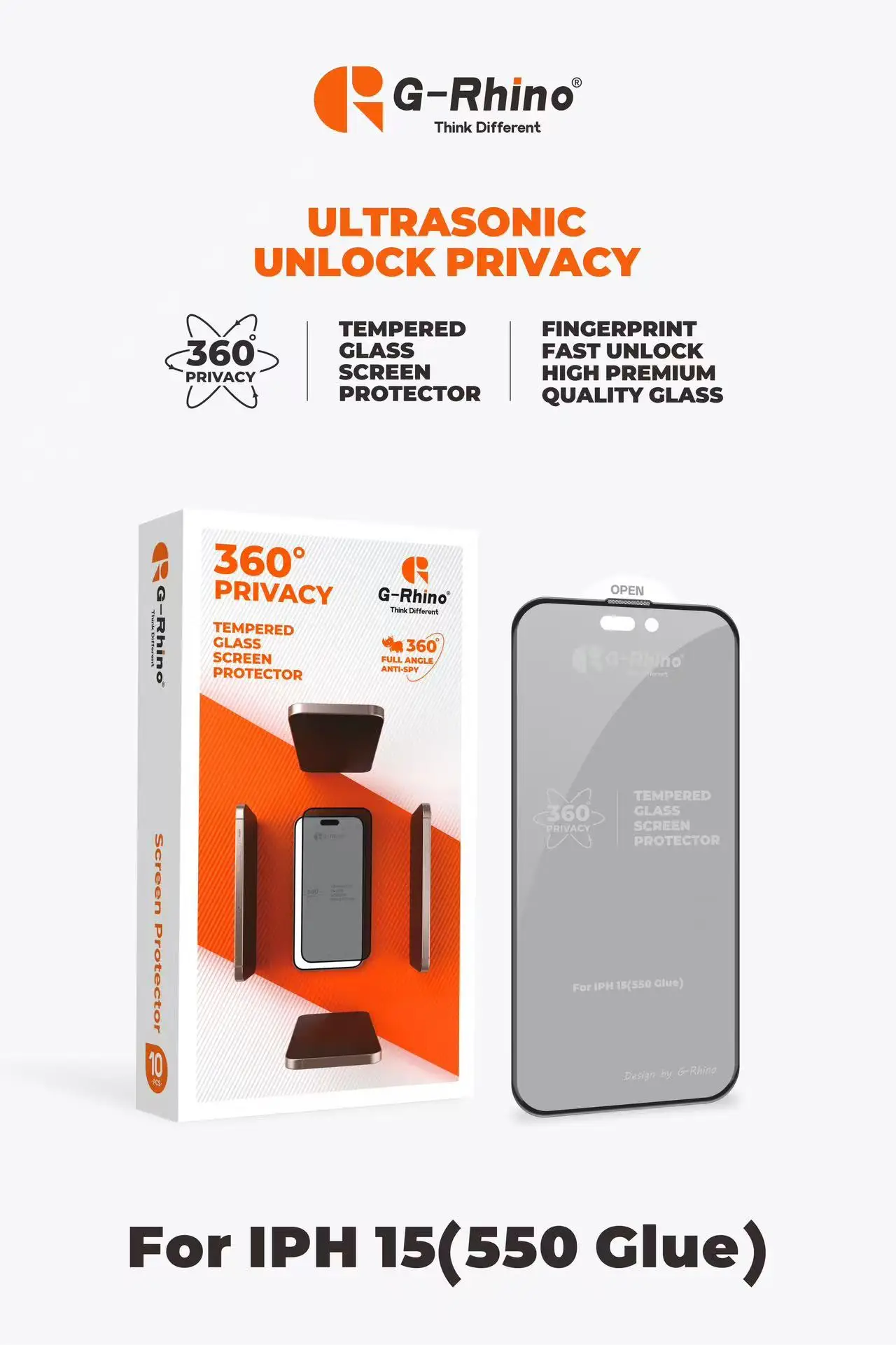 واقي الشاشة G-Rhino Private يتميز بكونه زجاج مقوى (Tempered Glass) بدرجة صلابة 9H لمقاومة الخدوش والصدمات، مع خاصية الخصوصية لحجب الرؤية الجانبية، ويحتوي على طبقات مقاومة للبصمات (Oleophobic)، ويوفر وضوحاً عالياً (HD Ultra Clearness) وحساسية لمس ممتازة، مع حواف منحنية (2.5D/3D) وتغطية كاملة للشاشة، ويأتي مع تقنية Full Glue لتثبيت مثالي، ويدعم التعرف على الوجه (Face ID) وخصائص مضادة للوهج (Anti-Glare) لحماية العين.