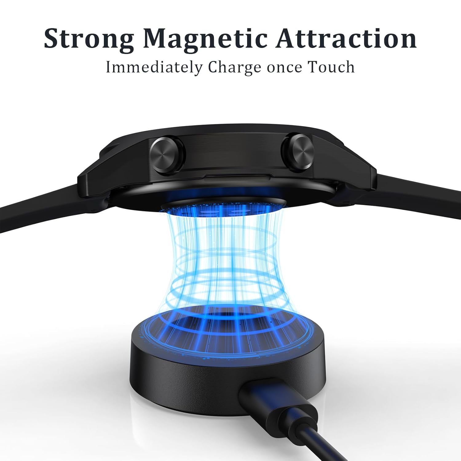 - كابل شحن مغناطيسي للساعة: تقوم قاعدة الشحن بتثبيت ساعتك تلقائيًا لضبط الزاوية دون التخلص من مركز جهاز الشحن. ما عليك سوى تثبيت القابس بالقرب من الجزء الخلفي من الساعة وستثبت المغناطيسات تلقائيًا في مكانها.