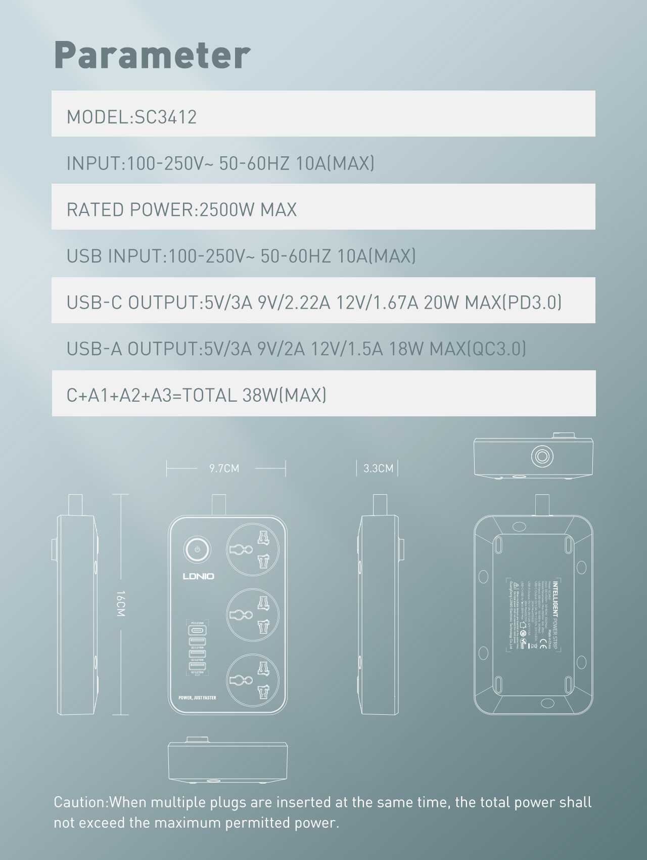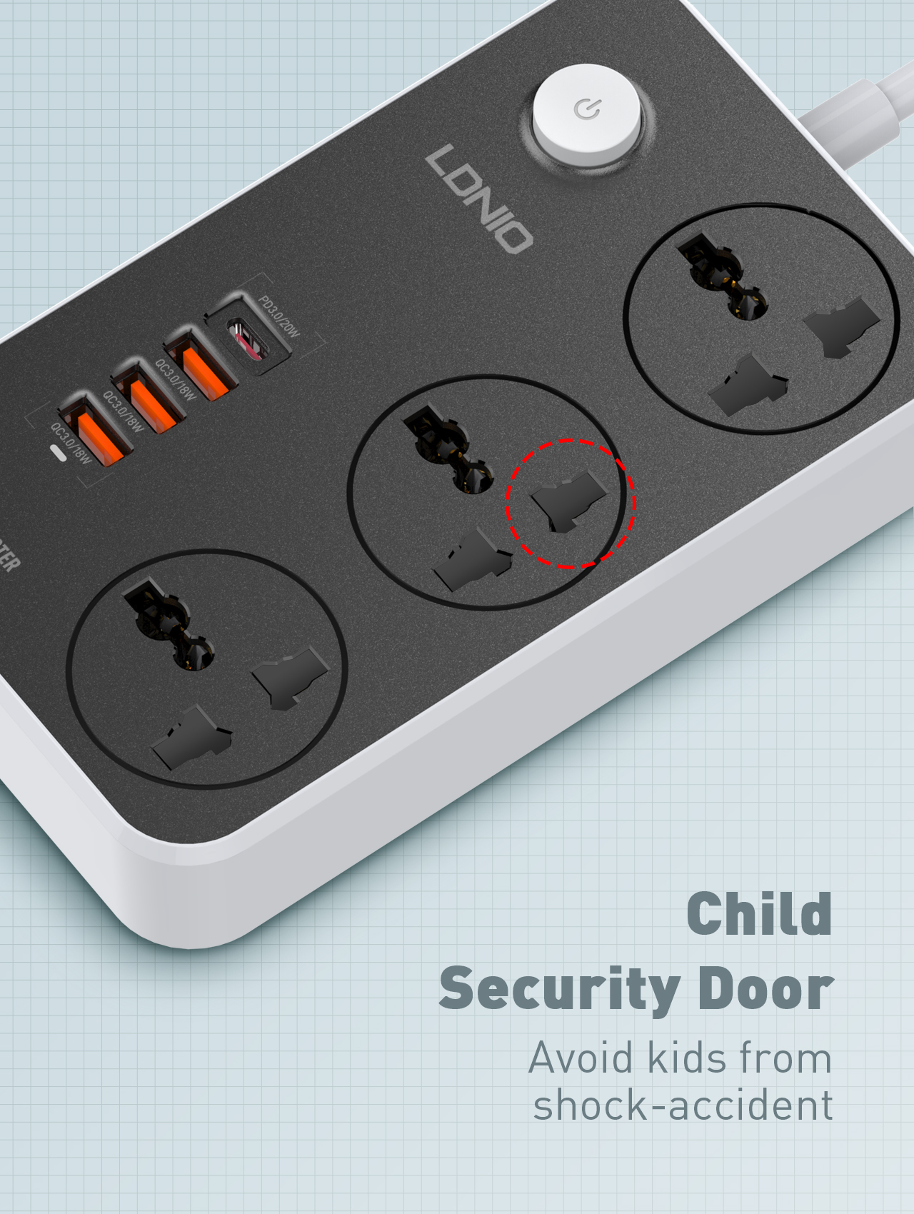 احصل على توصيلة LDNIO SC3412 PD بتقنية الشحن السريع 38 واط مع 3 منافذ كهرباء و3 منافذ USB 3.0 بميزة الشحن السريع بضمان 3سنوات