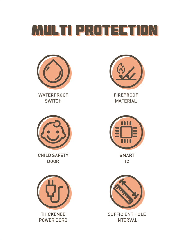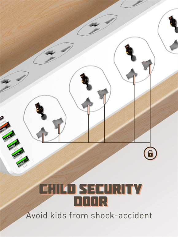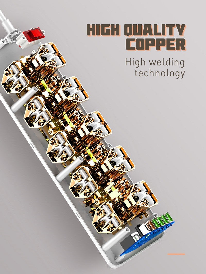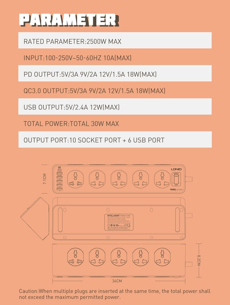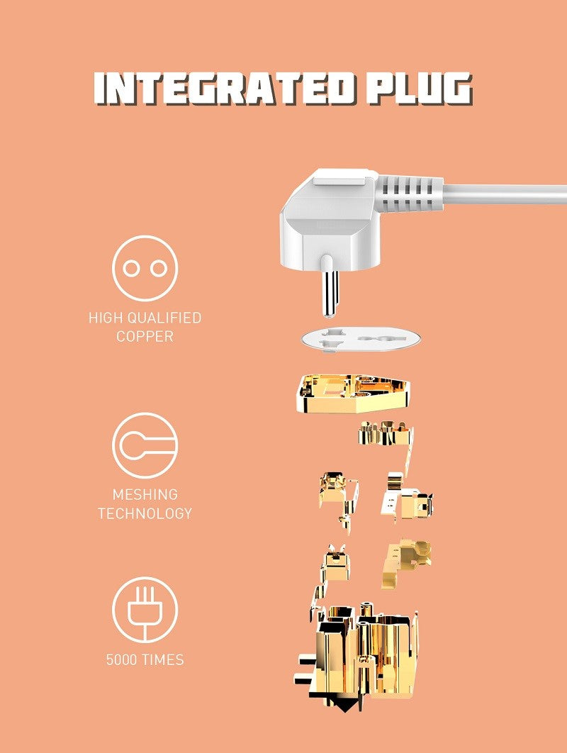 توفر منافذ USB الستة طاقة مخرجة 3.4 امبير. يساعد هذا التصميم الاستراتيجي لوصلة الكهرباء أيضًا في ضمان أداء مثالي لحماية دائمة. يضمن هيكل الوصلة المقاوم للحريق الاستخدام الآمن. بالإضافة إلى ذلك، يوفر كابل شديد التحمل بقوة 2500 واط تدفق الطاقة الأمثل للأجهزة المتصلة.