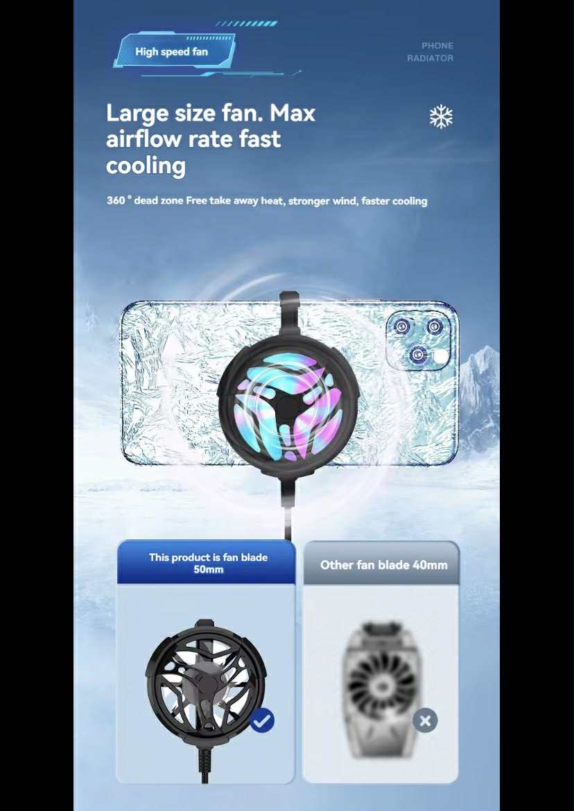 • تبريد فعال: يقلل من درجة حرارة الهاتف بشكل ملحوظ، خاصة أثناء gaming أو الشحن السريع.