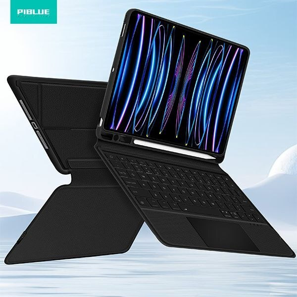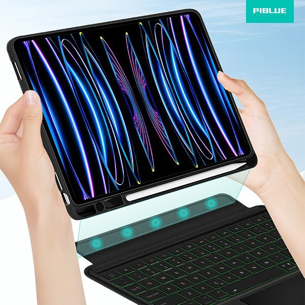 تأتي مجموعة Piblue مع حافظة مغناطيسية ولوحة مفاتيح بلوتوث، حيث تُثبّت لوحة المفاتيح بإحكام على الحافظة الواقية باستخدام شريط مغناطيسي قوي . يمكنك فصل لوحة المفاتيح وتخزينها بشكل منفصل، مع ترك الحافظة والحامل الخلفي. يتيح لك هذا الإعداد وضع جهاز iPad على حجرك للقراءة أو مشاهدة الفيديوهات أو الرسم. كما أن التبديل بين وضعَي iPad والكمبيوتر المحمول سهل للغاية.