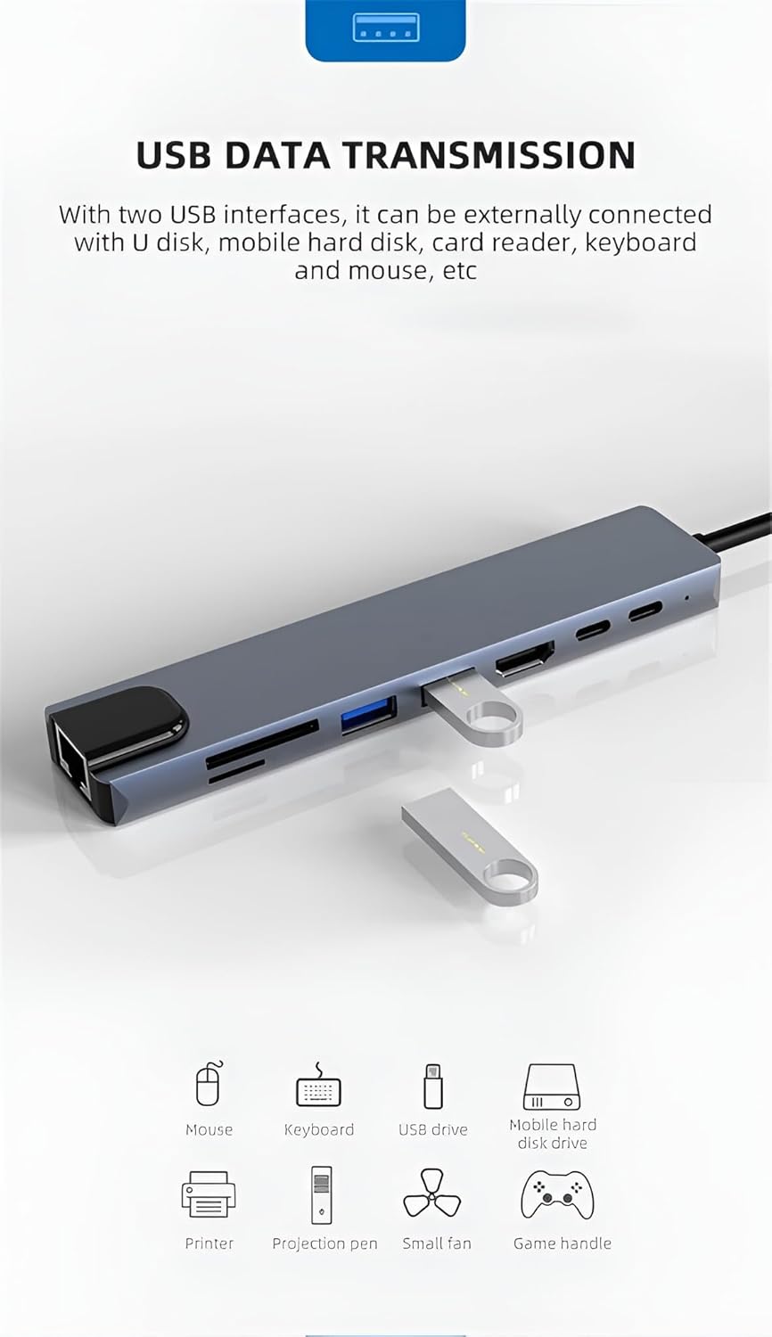 - المنافذ: Type-C (بيانات) ×1 USB-C PD (شحن سريع) حتى 87W (20V/3A) منفذا USB 3.0 (للوحة المفاتيح / الفأرة) منفذ HDTV (عرض حتى 4K UHD) منفذ RJ45 (شبكة LAN بسرعة 100/1000 ميجابت) قارئ بطاقة SD ×1 قارئ بطاقة TF (microSD) ×1