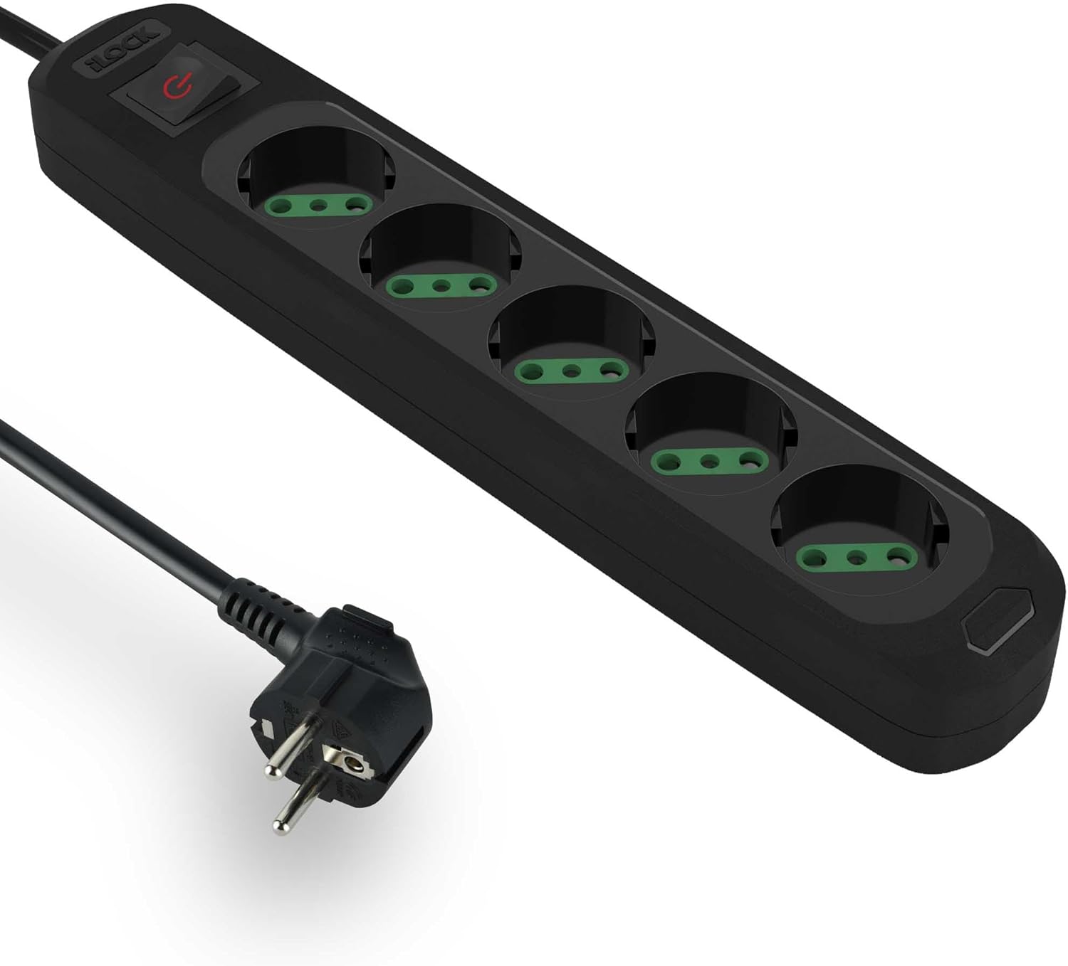 مشترك كهربائي من اي لوك، 5 منافذ مع مفتاح، بجهد 3500 وات، (لون أسود، 1.5 متر) .