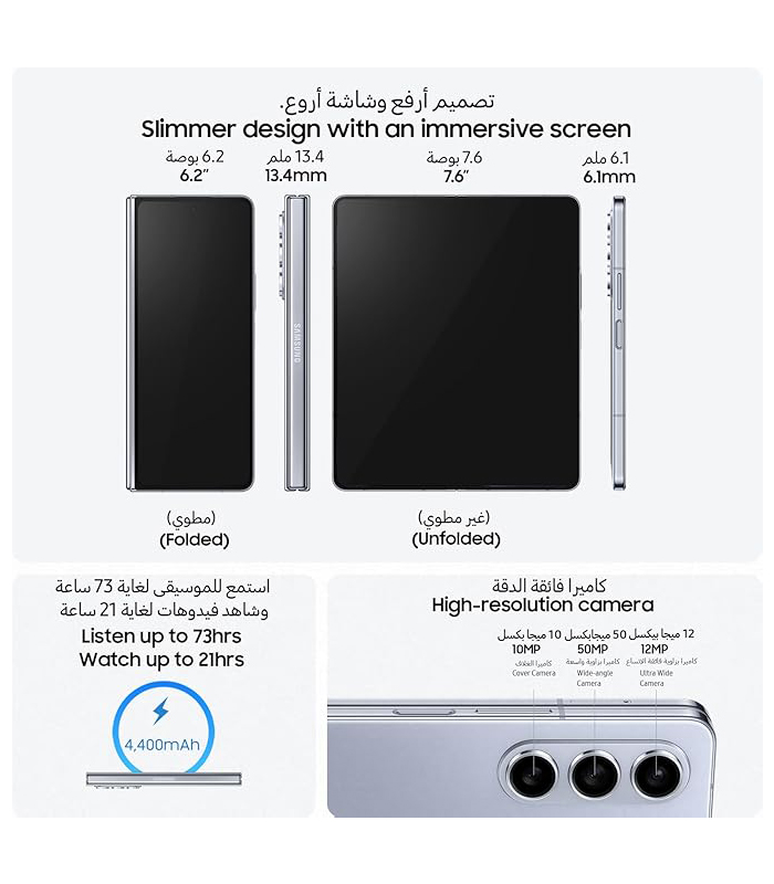 - شاشة عرض رئيسية غامرة: اكتشف الشاشة المذهلة بحجمها الكبير مقاس 7.6 بوصة والمصممة لتمنحك تجربة مشاهدة لم يسبق لها مثيل. يتميز بمفصلة مرنة معاد تصميمها لتتمكن من طي موبايل سامسونج جالاكسي Z فولد 5 بإحكام للحصول على قبضة آمنة.