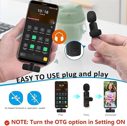 - اتصال تلقائي سهل: هذا الميكروفون اللاسلكي المبتكر يتميز بإعداد أسهل بكثير. لا حاجة إلى محول أو بلوتوث أو تطبيق. ما عليك سوى توصيل جهاز الاستقبال بأجهزتك (واجهة USB)، ومن ثم تشغيل الميكروفون المحمول، وسيقترن هذين الجزأين تلقائيًا. ملاحظة: تأكد من تفعيل USB او تي جي في إعداد جهازك.
