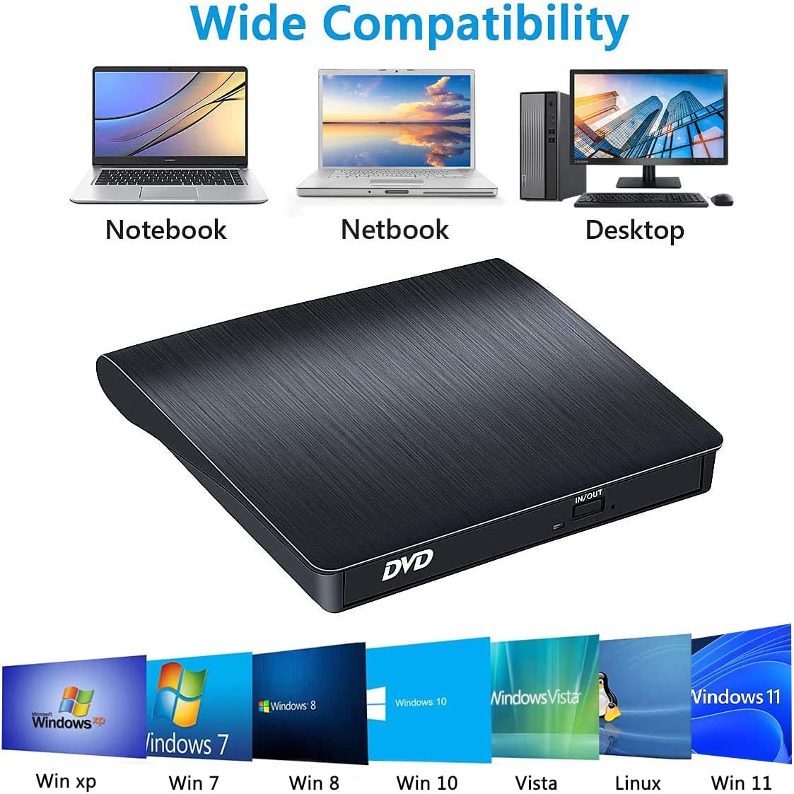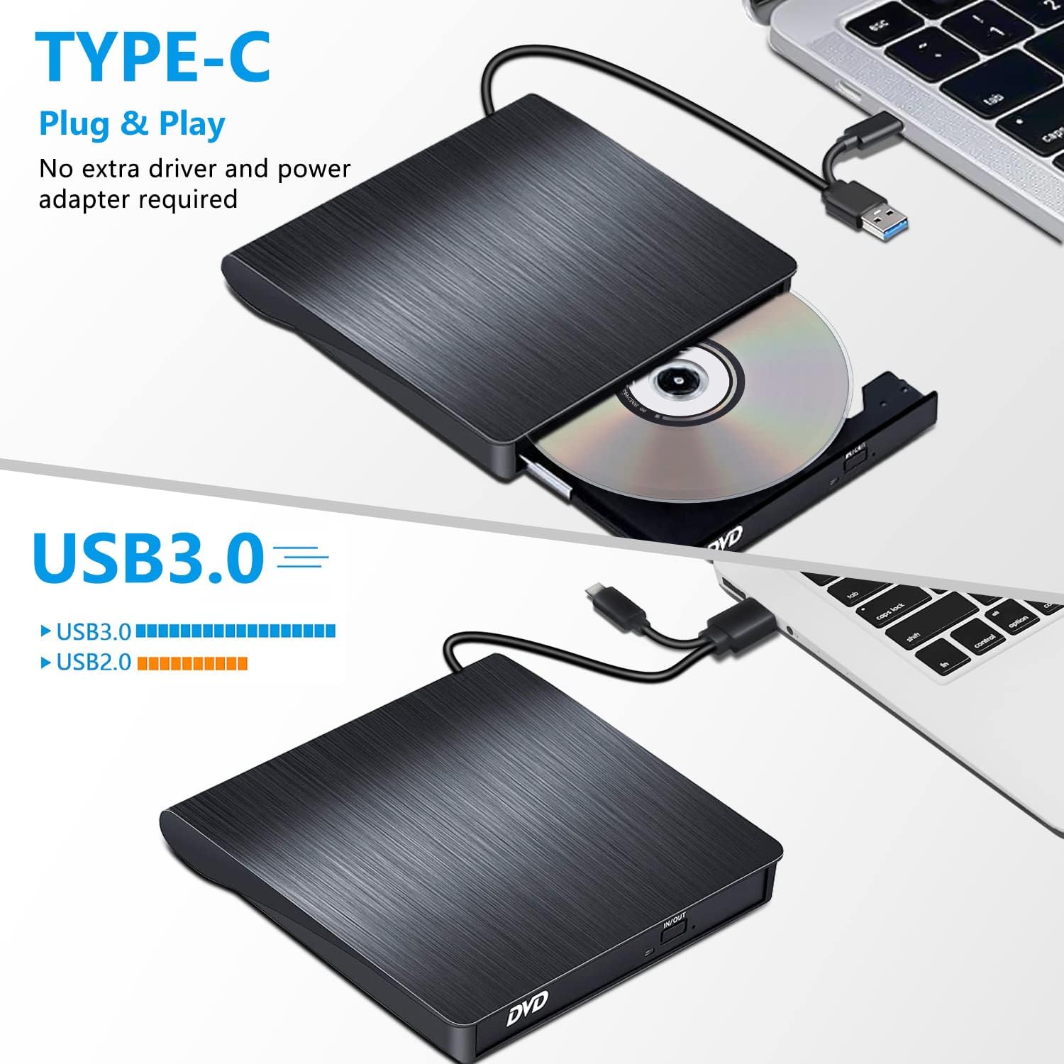 - ➤ متعددة الوظائف: شاهد الأفلام / حرق الموسيقى ومقاطع الفيديو والبرامج والألعاب / تثبيت النسخ الاحتياطي للبيانات والملفات/العروض التقديمية وما إلى ذلك. نسخ أيضًا مع واجهة USB 3.0 ونوع C، وهي مناسبة لأجهزة الكمبيوتر المزودة بمنفذ USB 3.0 أو النوع C، مما يعني أنها مناسبة لمعظم أجهزة الكمبيوتر واللاب توب.