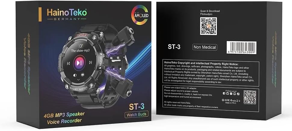 ساعة Haino Teko الذكية ST-3 مع سماعات بلوتوث مدمجة ومكبر صوت MP3 سعة 4 جيجابايت وشاشة AMOLED مستديرة كبيرة مع شحن لاسلكي .