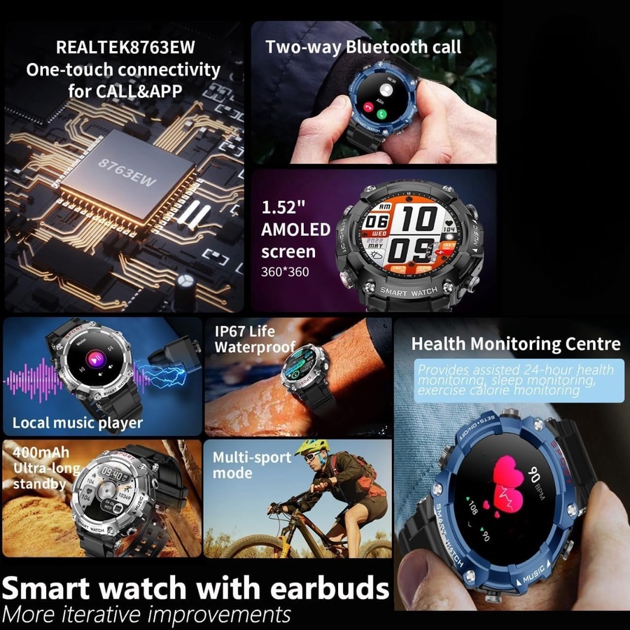 • سماعات أذن لاسلكية مدمجة: توفر لك السماعات اللاسلكية المدمجة حرية الاستمتاع بالمقاطع الصوتية المفضلة لديك دون الحاجة إلى استخدام الأسلاك، كما يمكنك التحكم في الصوتيات وتغييرها من خلال الساعة بسهولة.